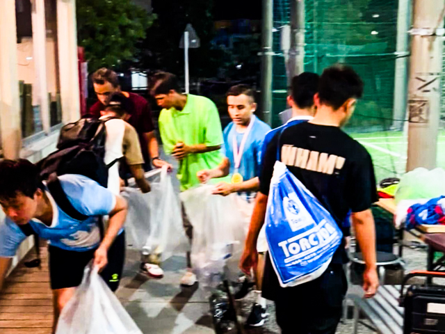 いろいろな 国(くに)の 友(とも)だちと いっしょに スポーツをして、